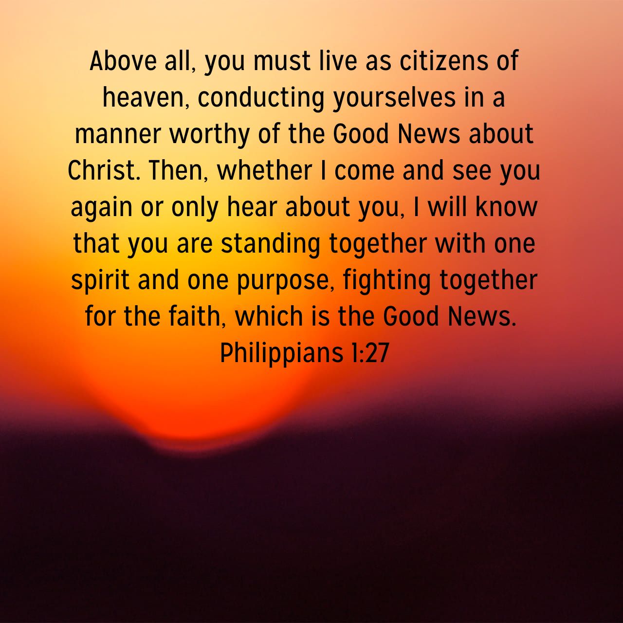 “Above all, you must live as citizens of heaven, conducting yourselves in a manner worthy of the Good News about Christ. Then, whether I come and see you again or only hear about you, I will know that you are standing together with one spirit and one purpose, fighting together for the faith, which is the Good News.”